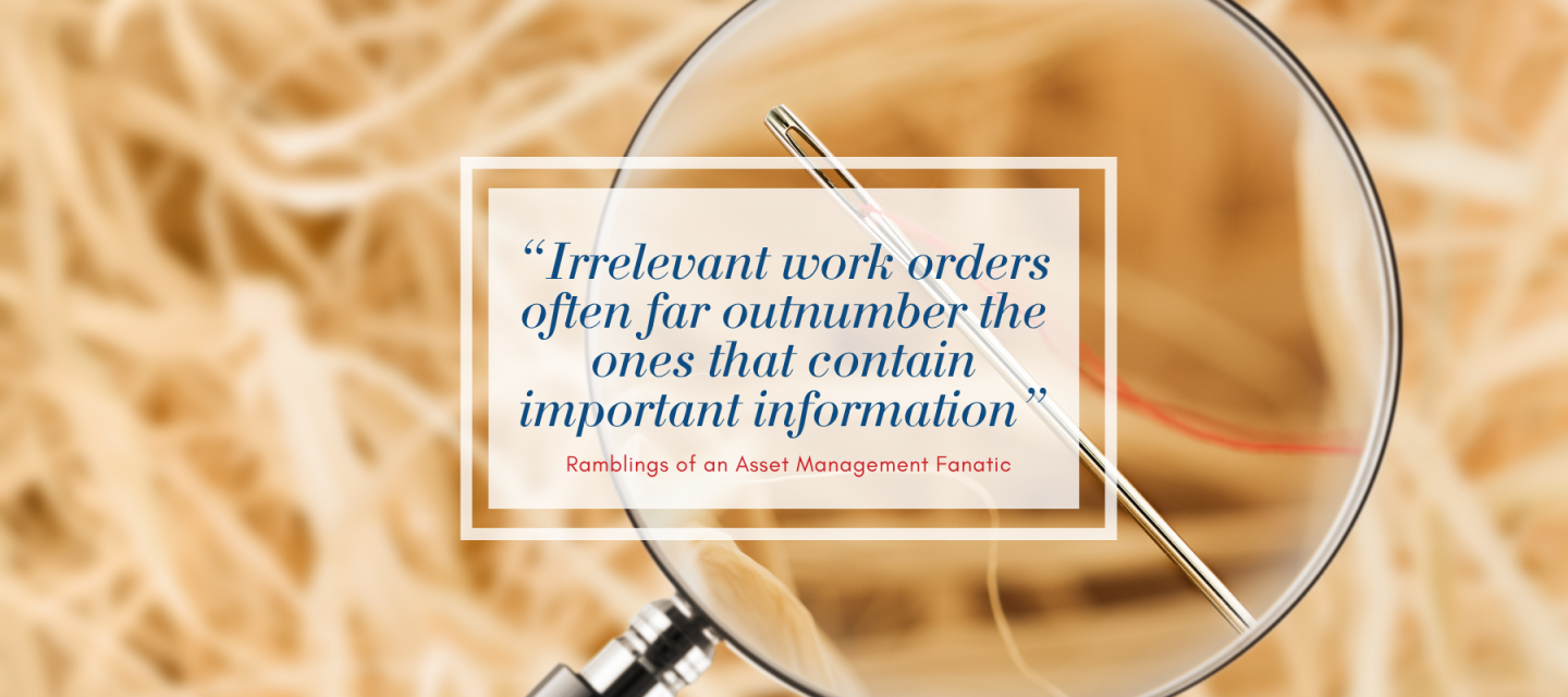 I have been involved in many projects where a client shares work order history with us as part of our background information. There are usually two big challenges. The first is that work orders are not associated with a specific piece of equipment (see my last post for the issues this causes). The second is that there are so many work orders that have little or no impact on deciding when to study, repair or replace a piece of equipment.